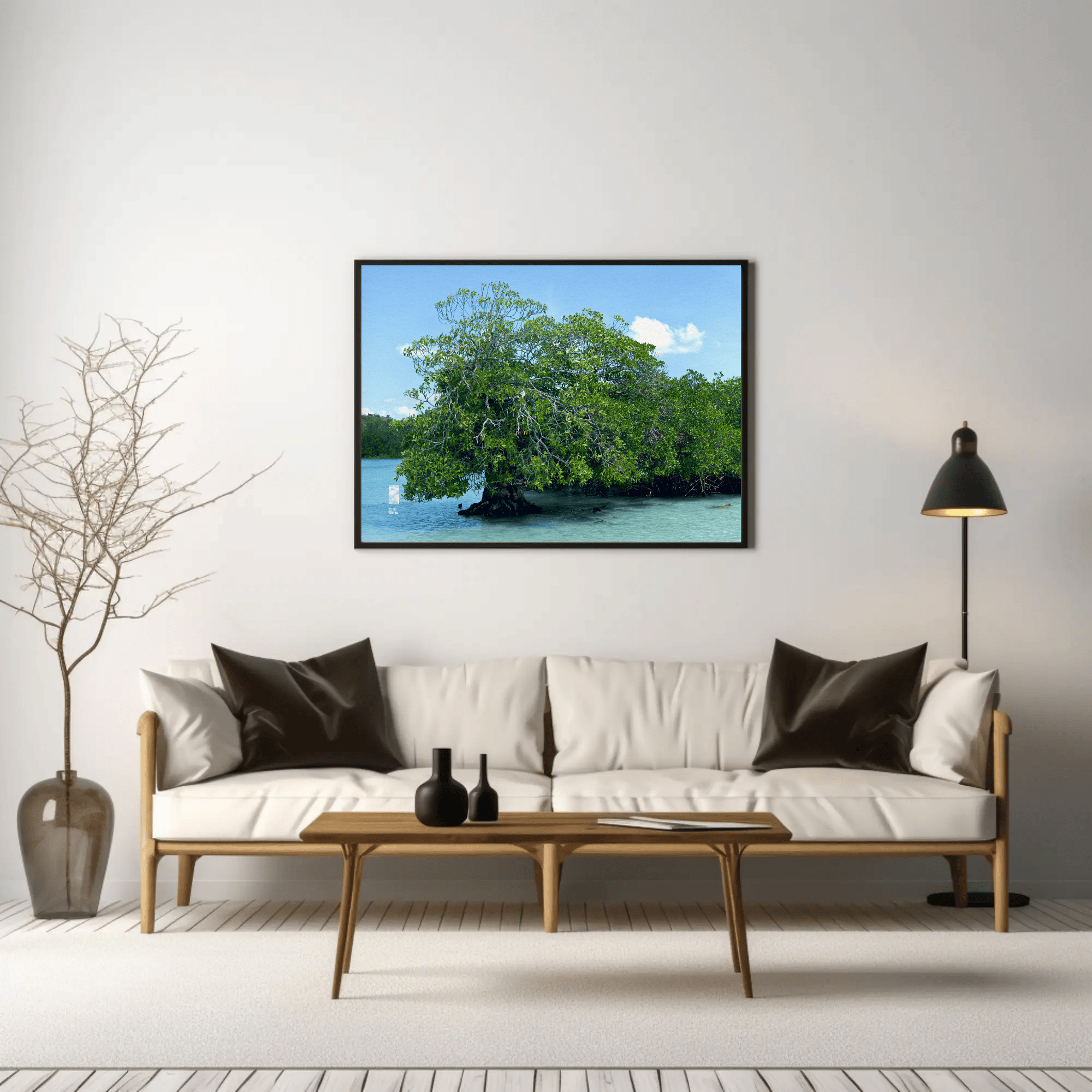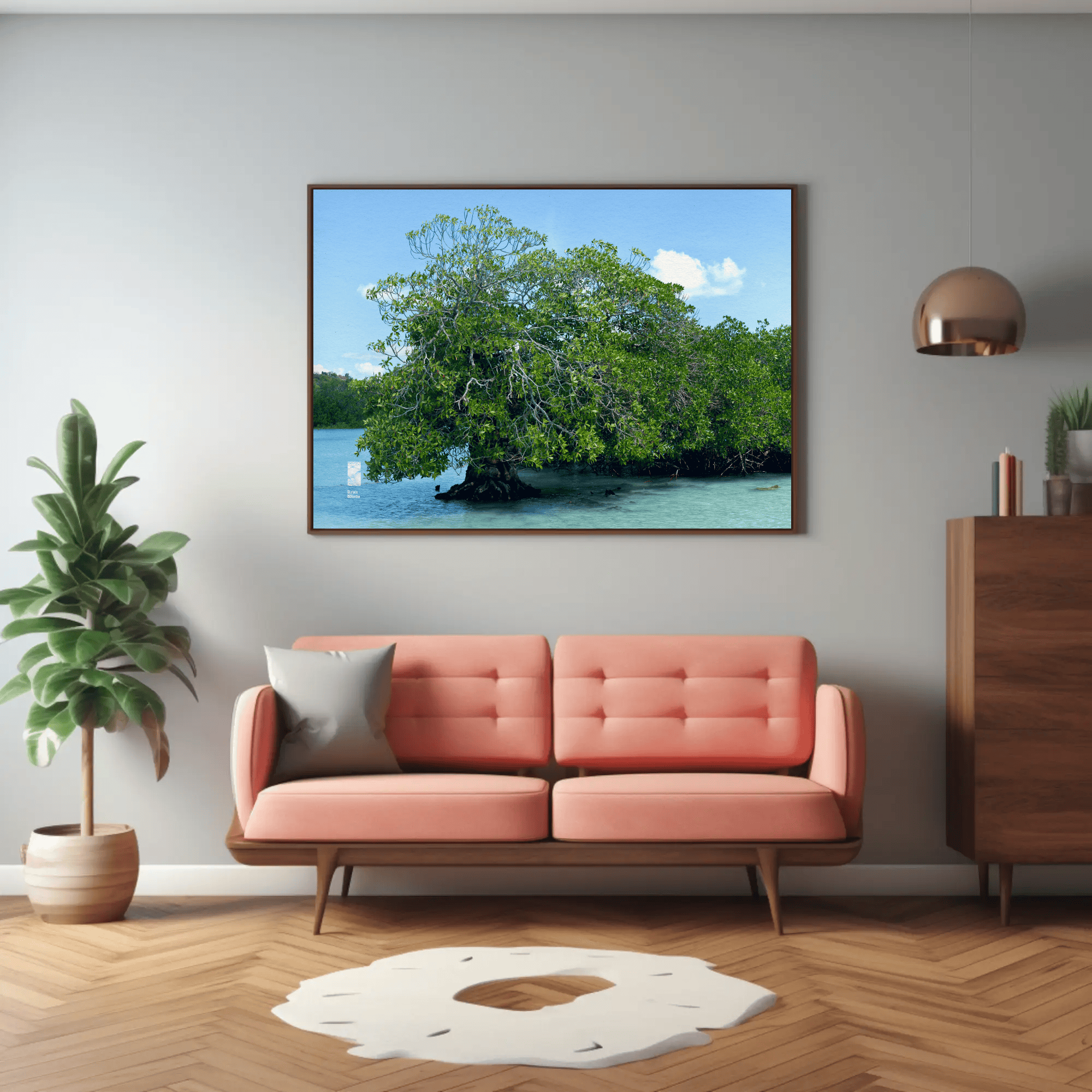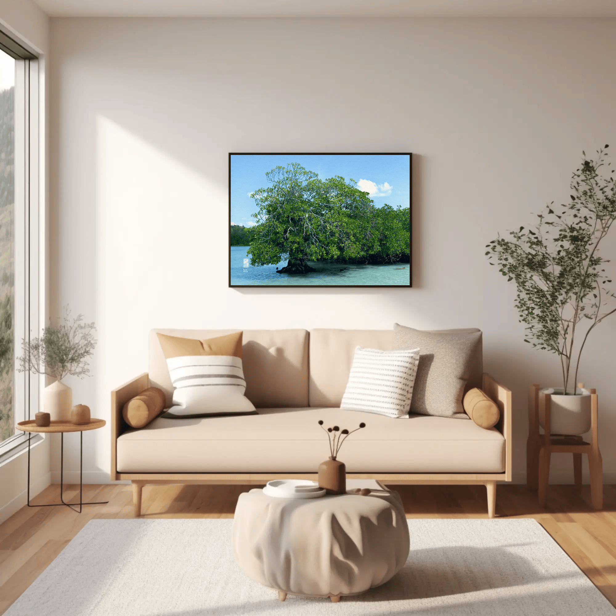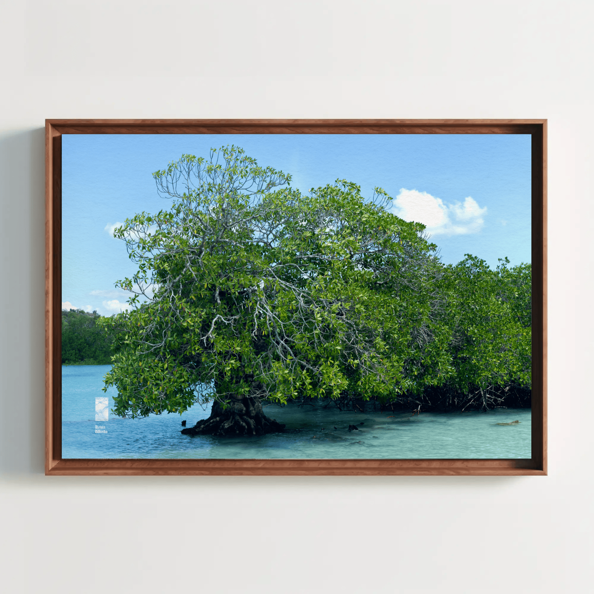 The photo print backdrop features soft blue beach and white sand of Rote Island's adding depth to the composition. This canvas print would evoke a sense of calm and connection to nature, highlighting the importance of mangroves in coastal ecosystems.