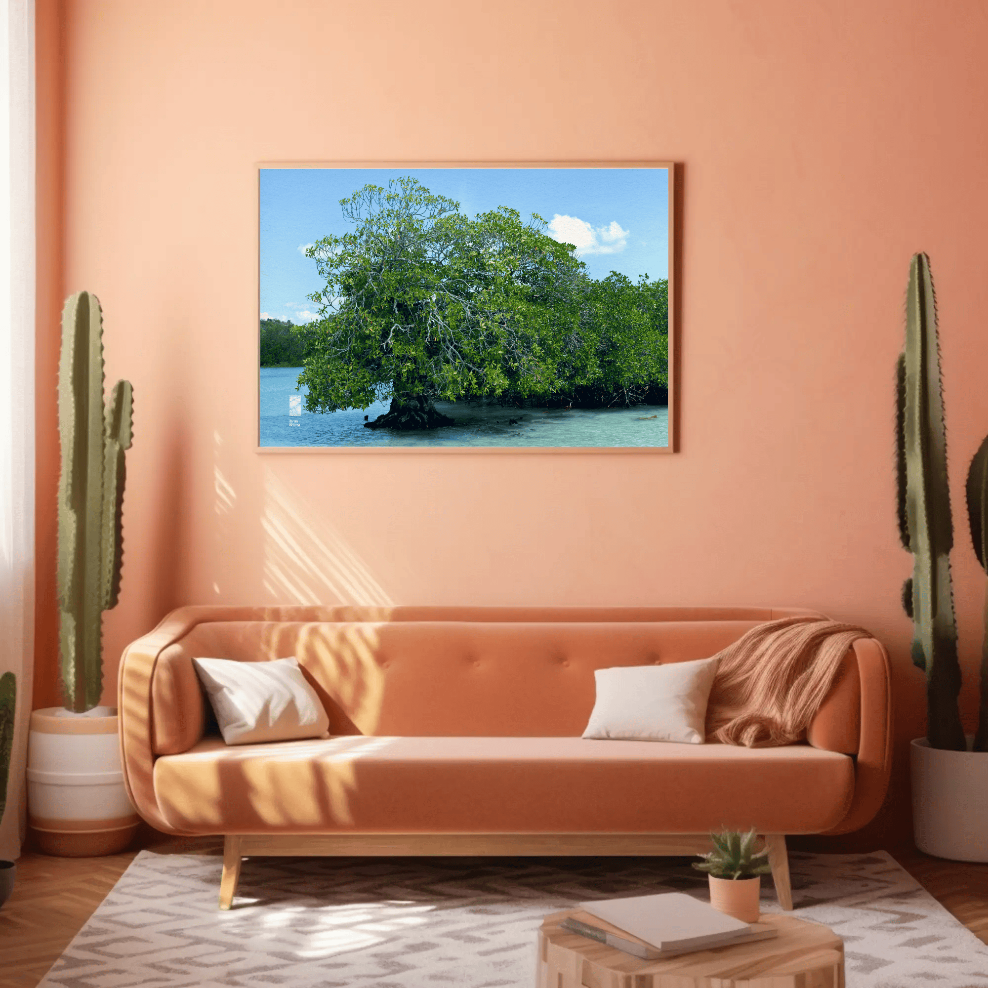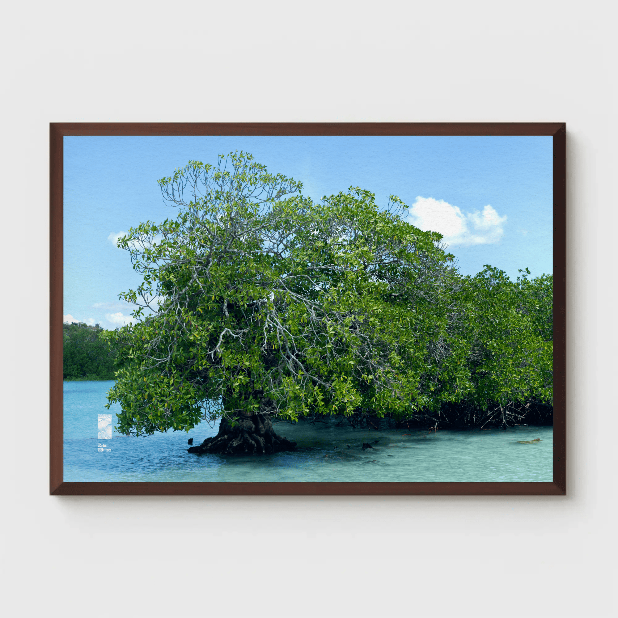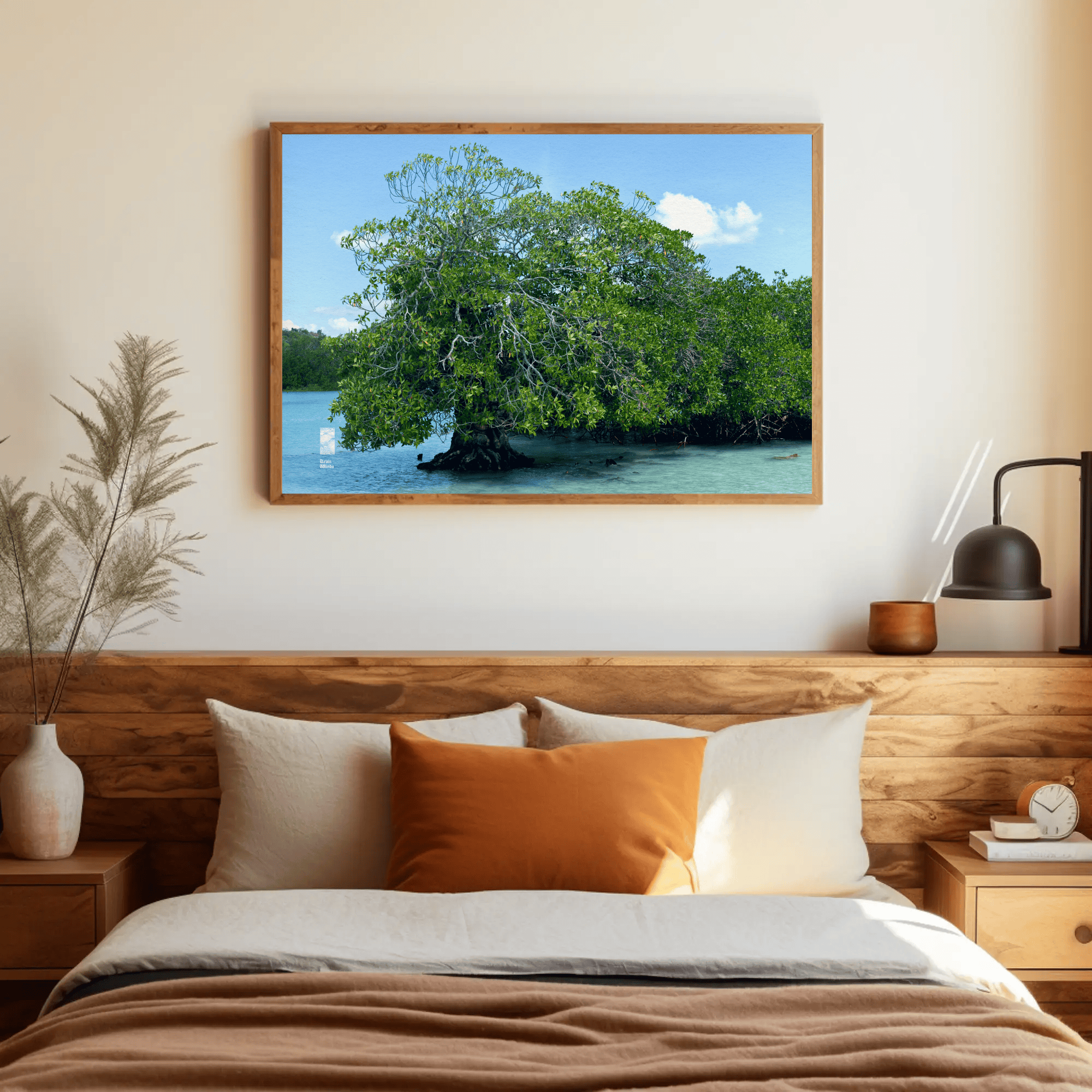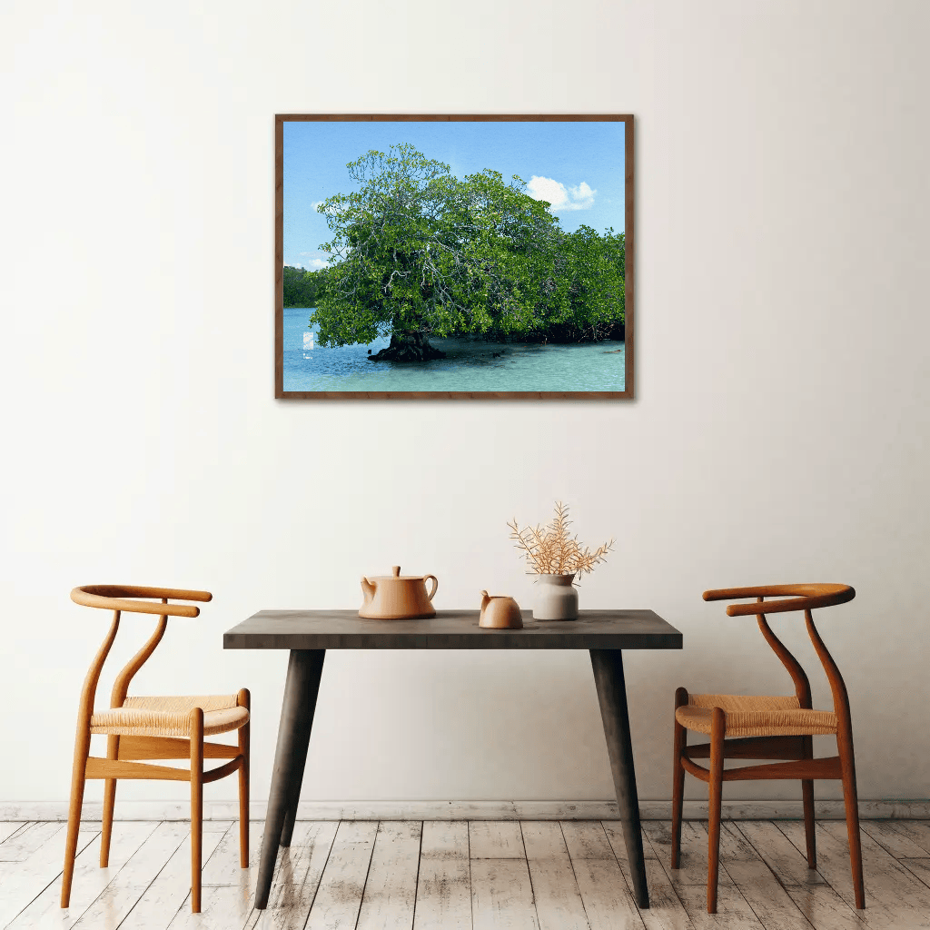 The photo print backdrop features soft blue beach and white sand of Rote Island's adding depth to the composition. This canvas print would evoke a sense of calm and connection to nature, highlighting the importance of mangroves in coastal ecosystems.