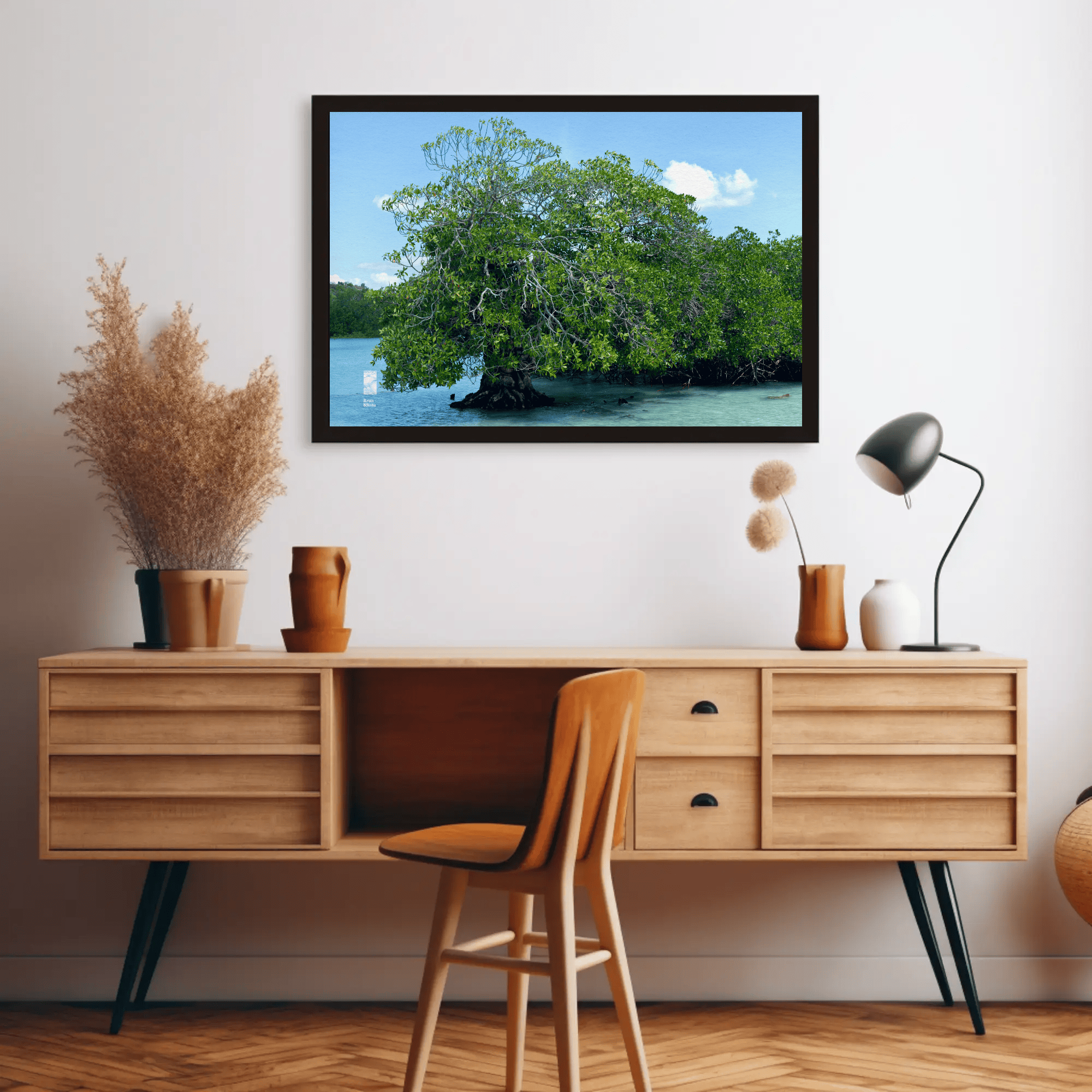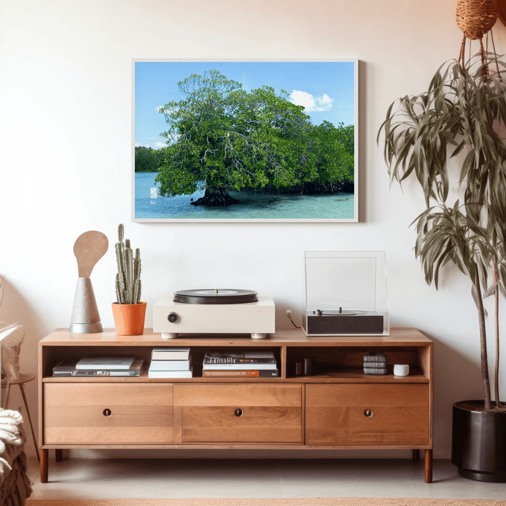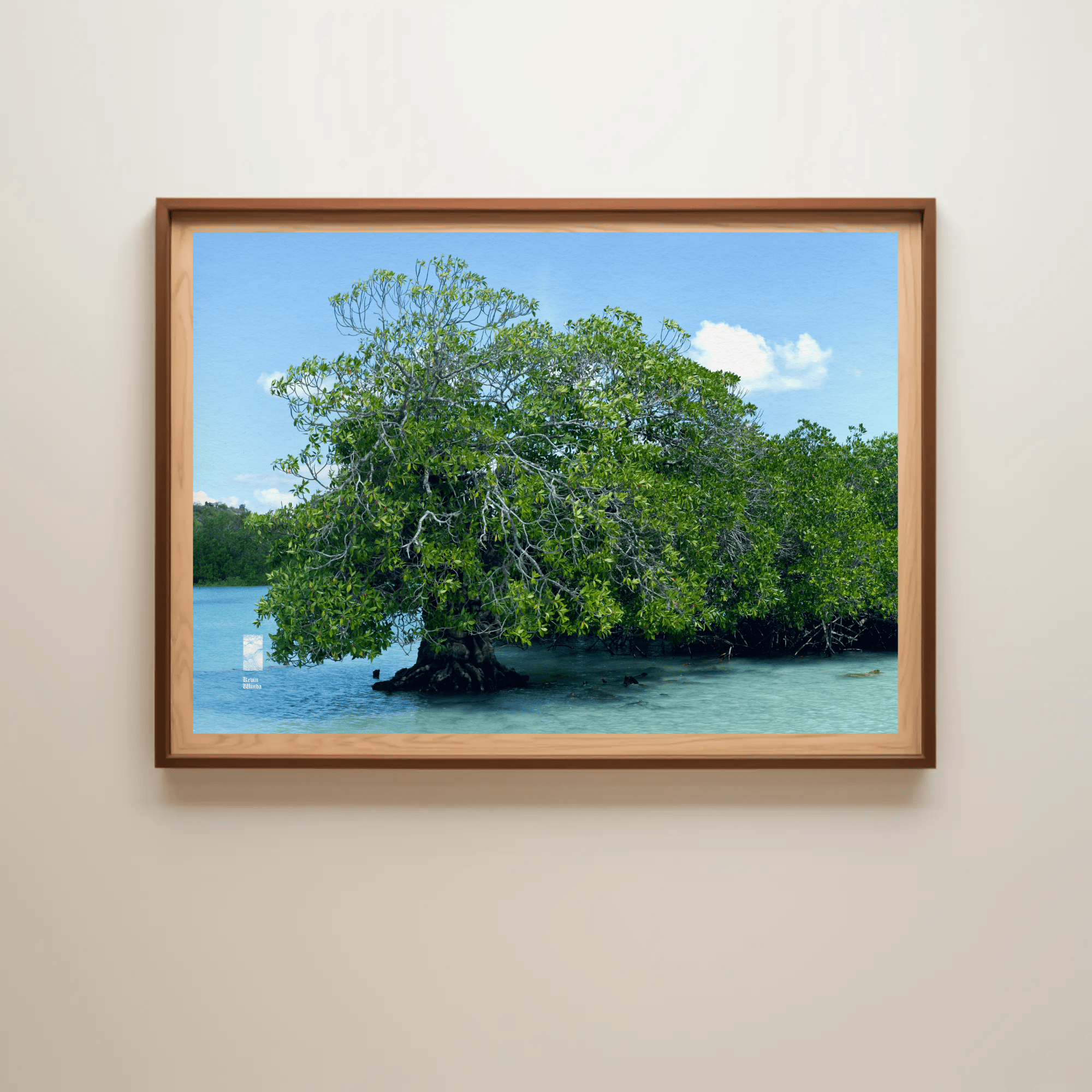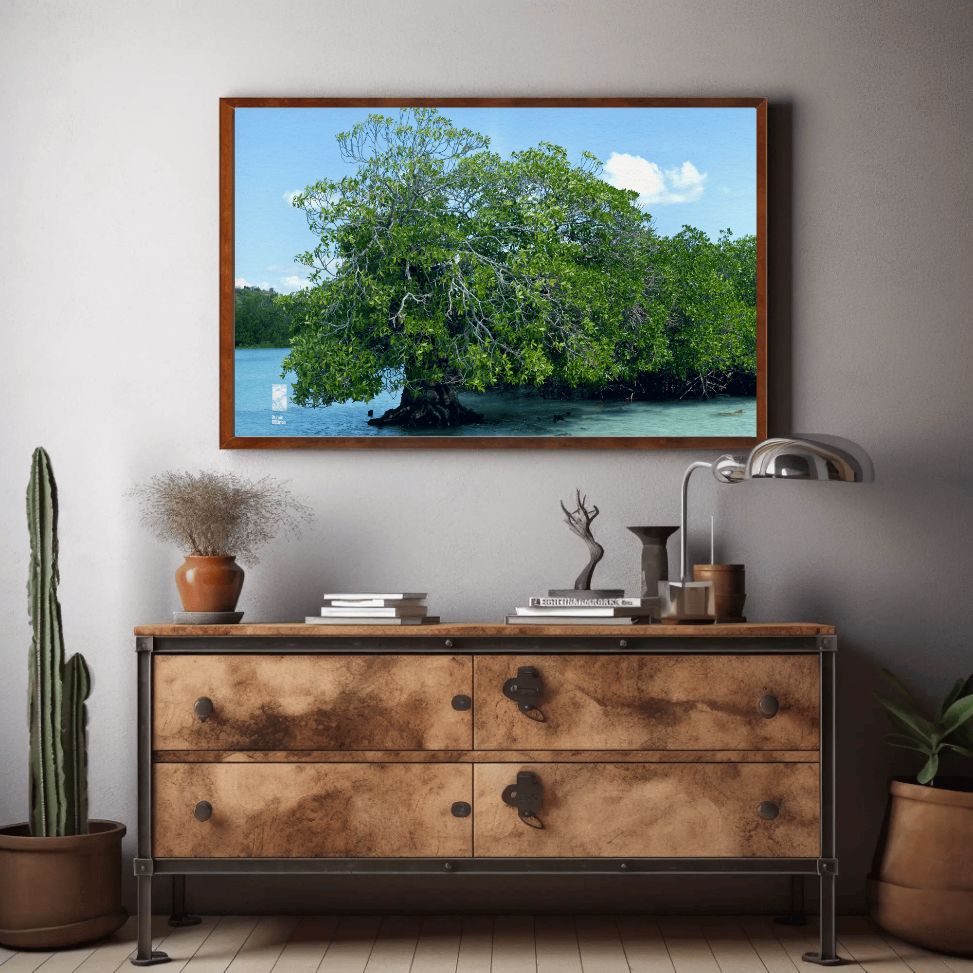 The photo print backdrop features soft blue beach and white sand of Rote Island's adding depth to the composition. This canvas print would evoke a sense of calm and connection to nature, highlighting the importance of mangroves in coastal ecosystems.