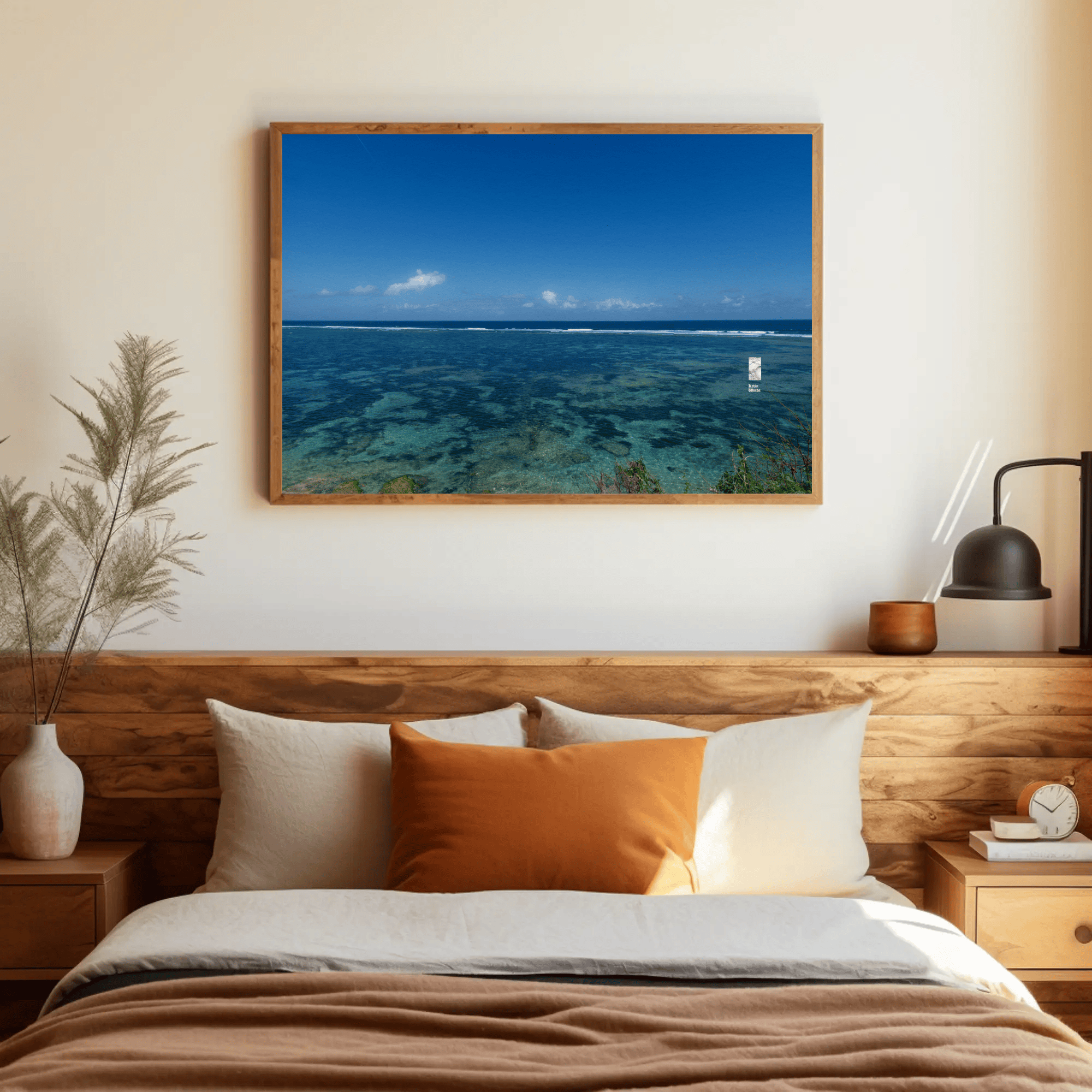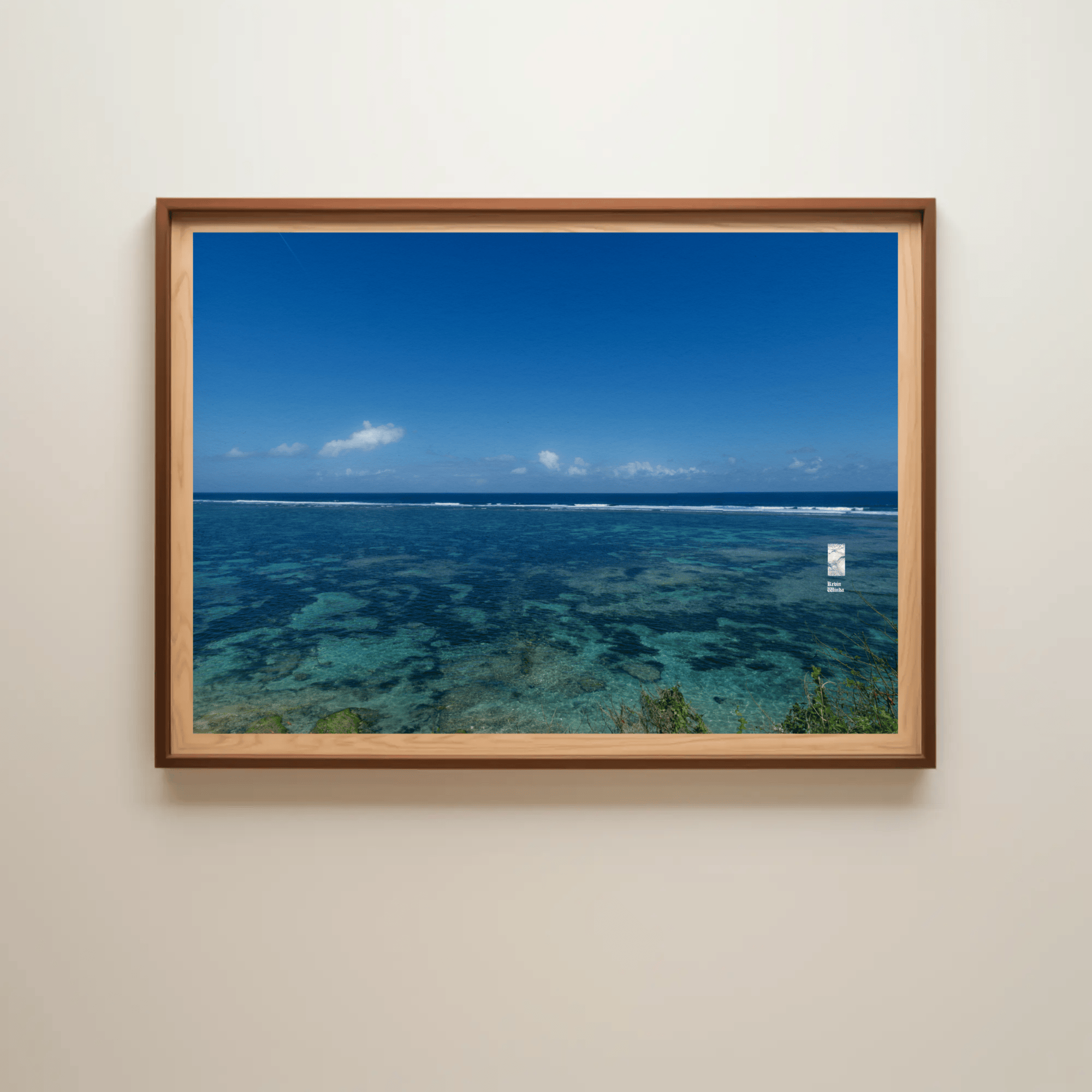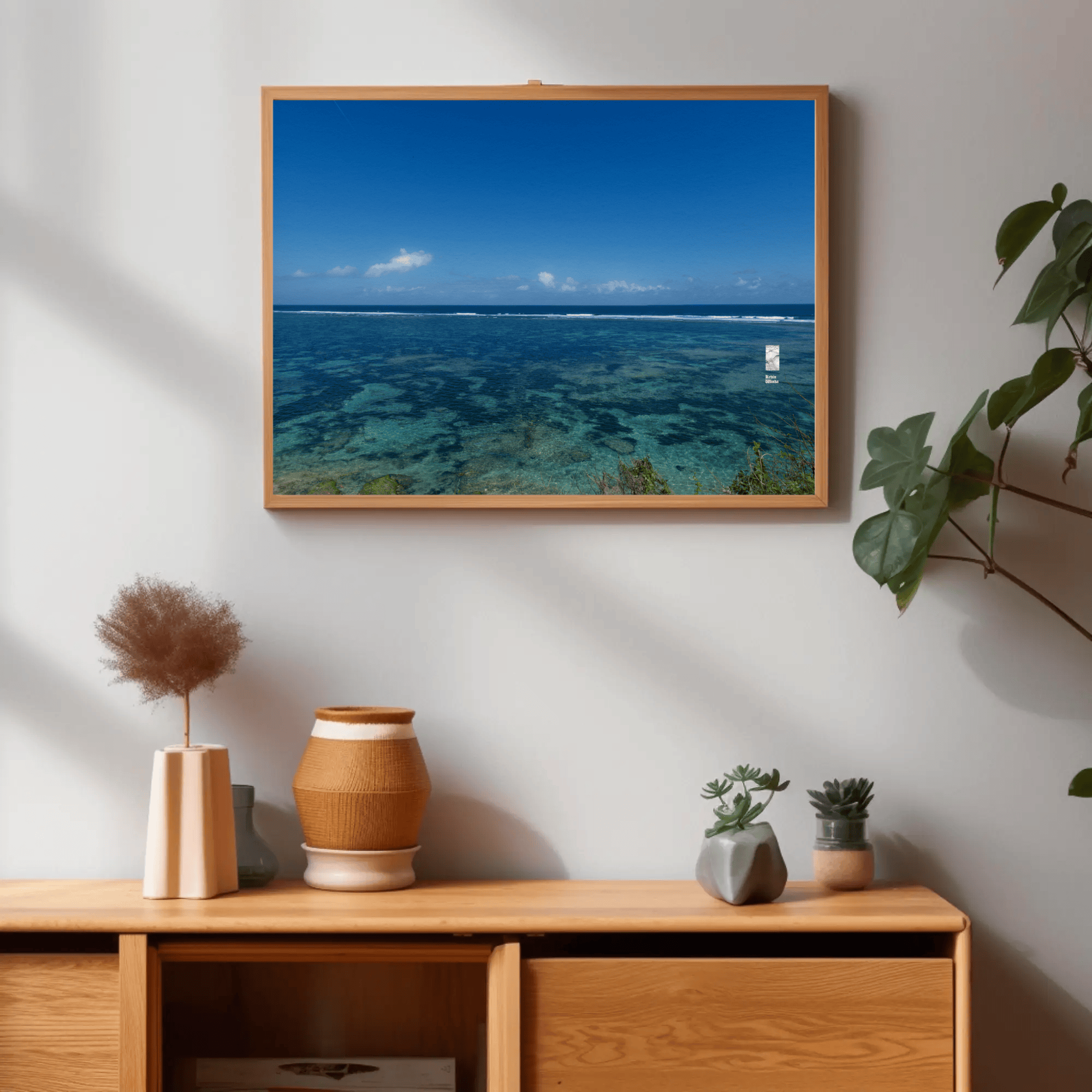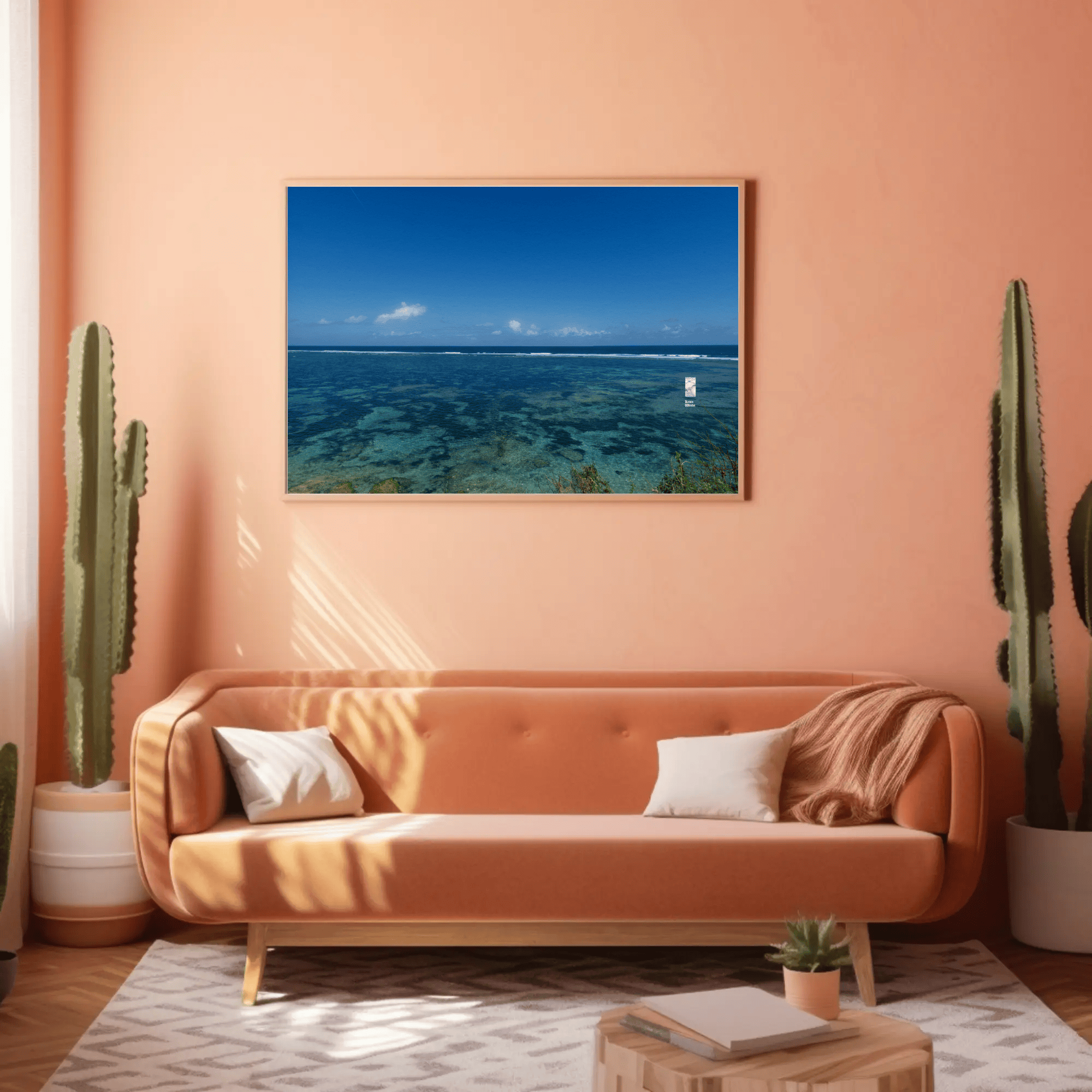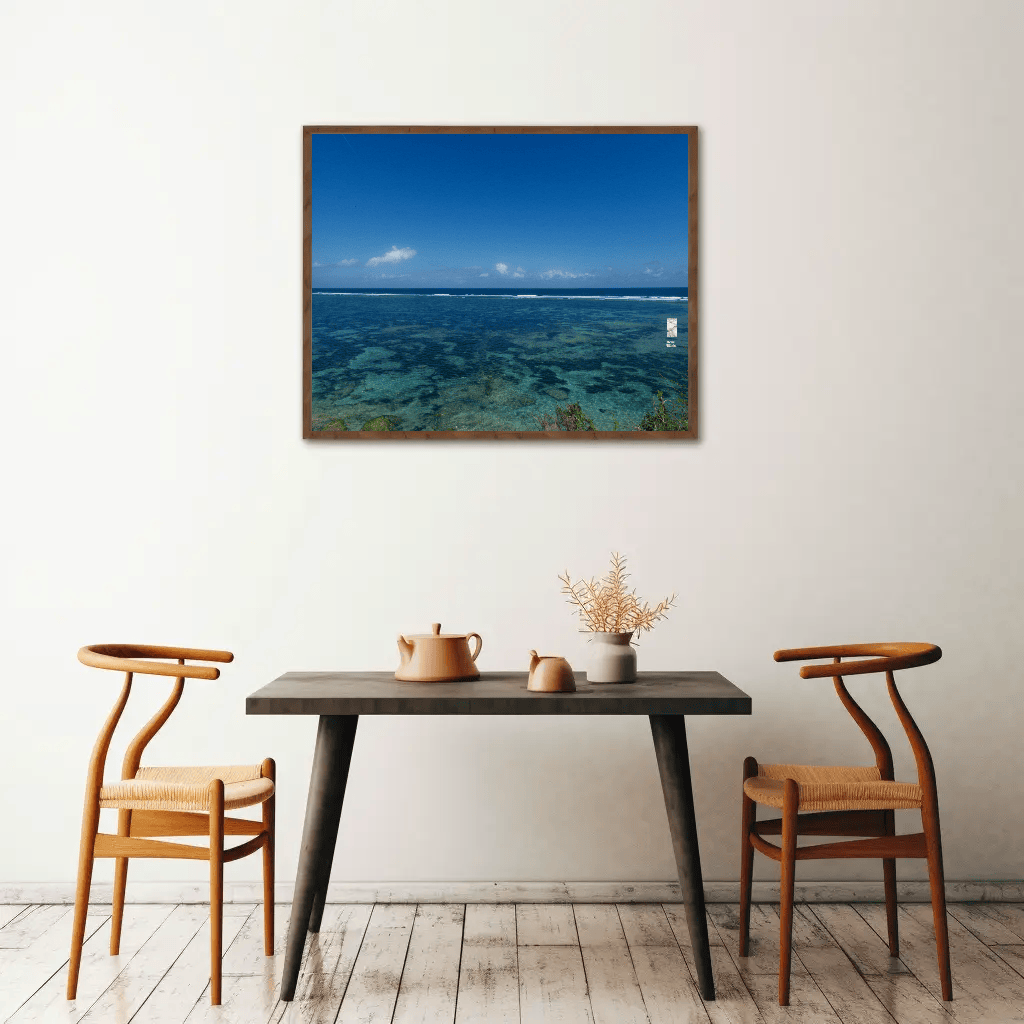 The interplay of clear skies, radiant sunlight, and the natural textures of the sea and reefs creates a vivid and meditative canvas. This piece invites viewers to pause, reflect, and connect with the raw beauty of nature, making it ideal for spiritual seekers and those pursuing mindfulness.