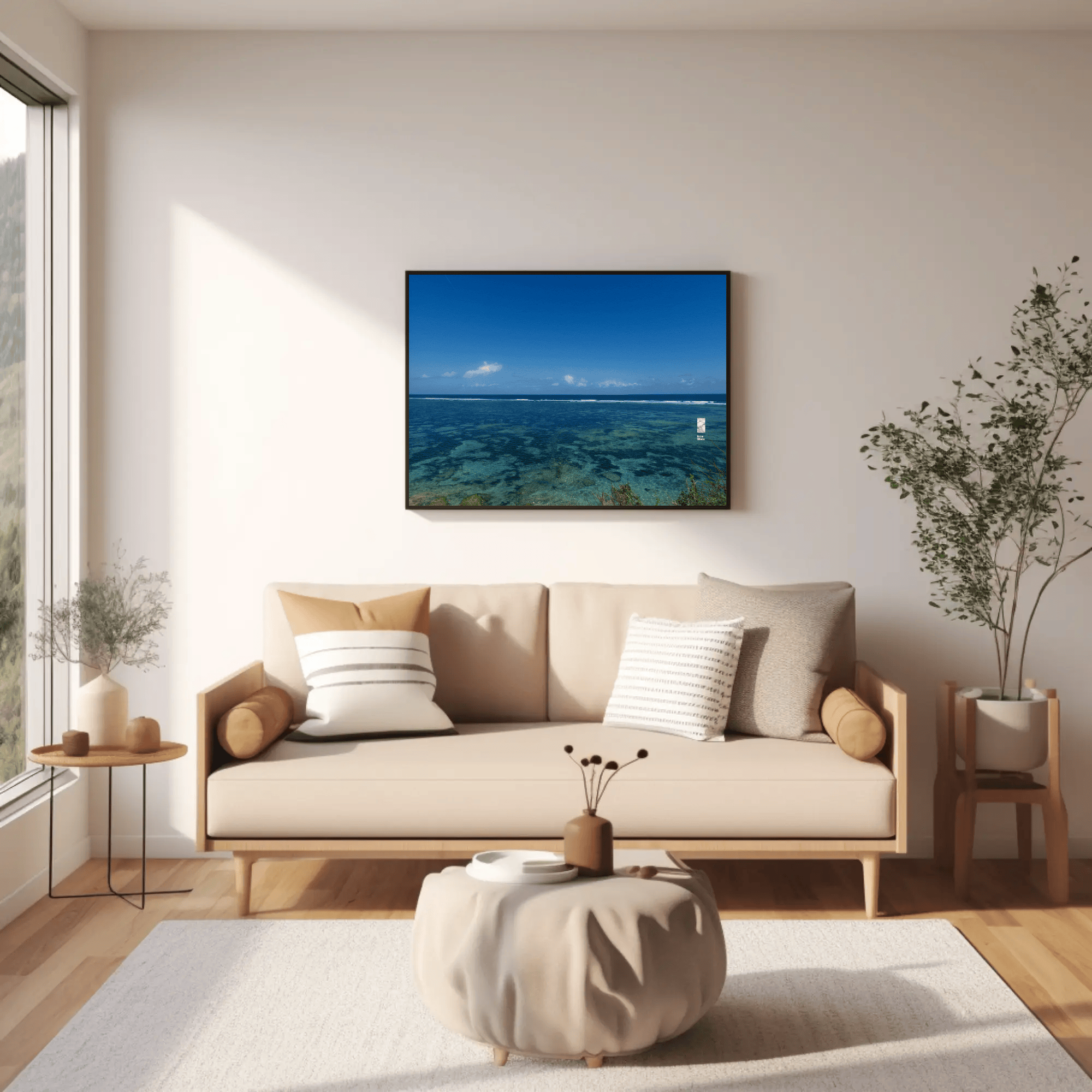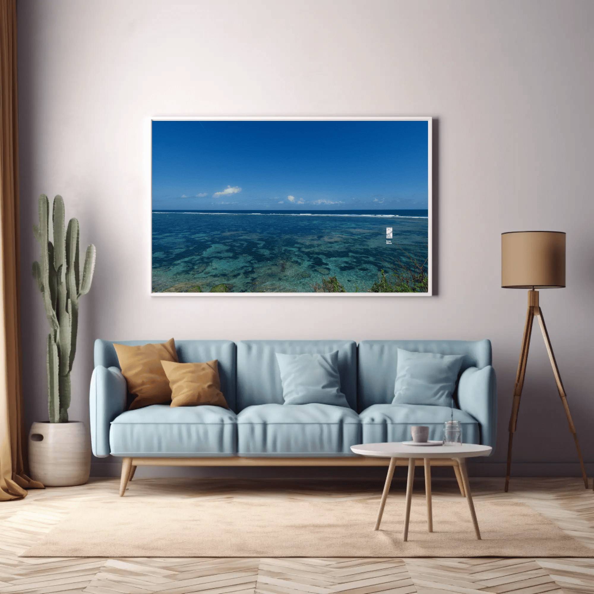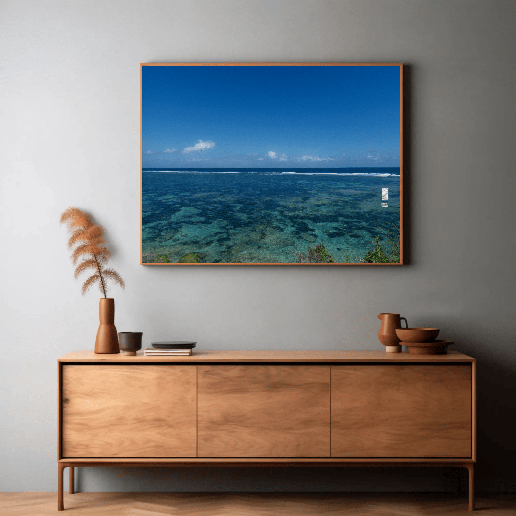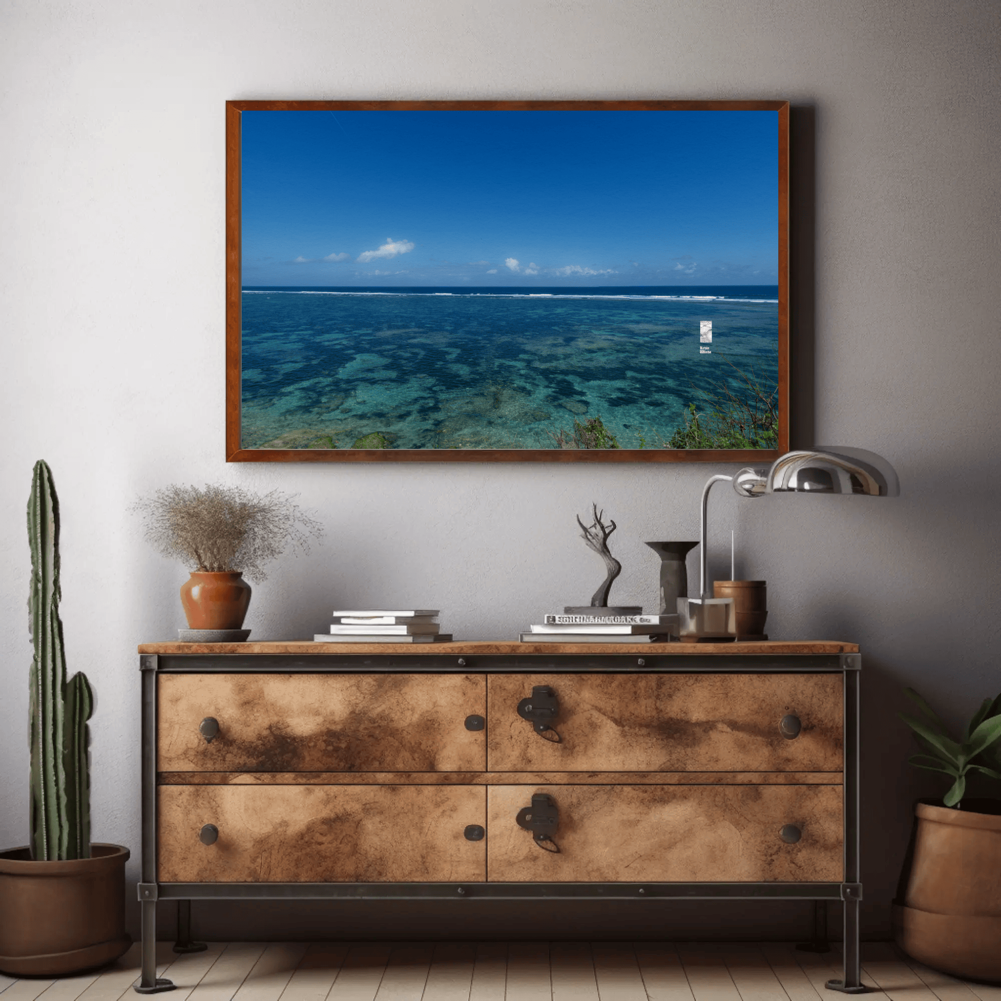 The interplay of clear skies, radiant sunlight, and the natural textures of the sea and reefs creates a vivid and meditative canvas. This piece invites viewers to pause, reflect, and connect with the raw beauty of nature, making it ideal for spiritual seekers and those pursuing mindfulness.