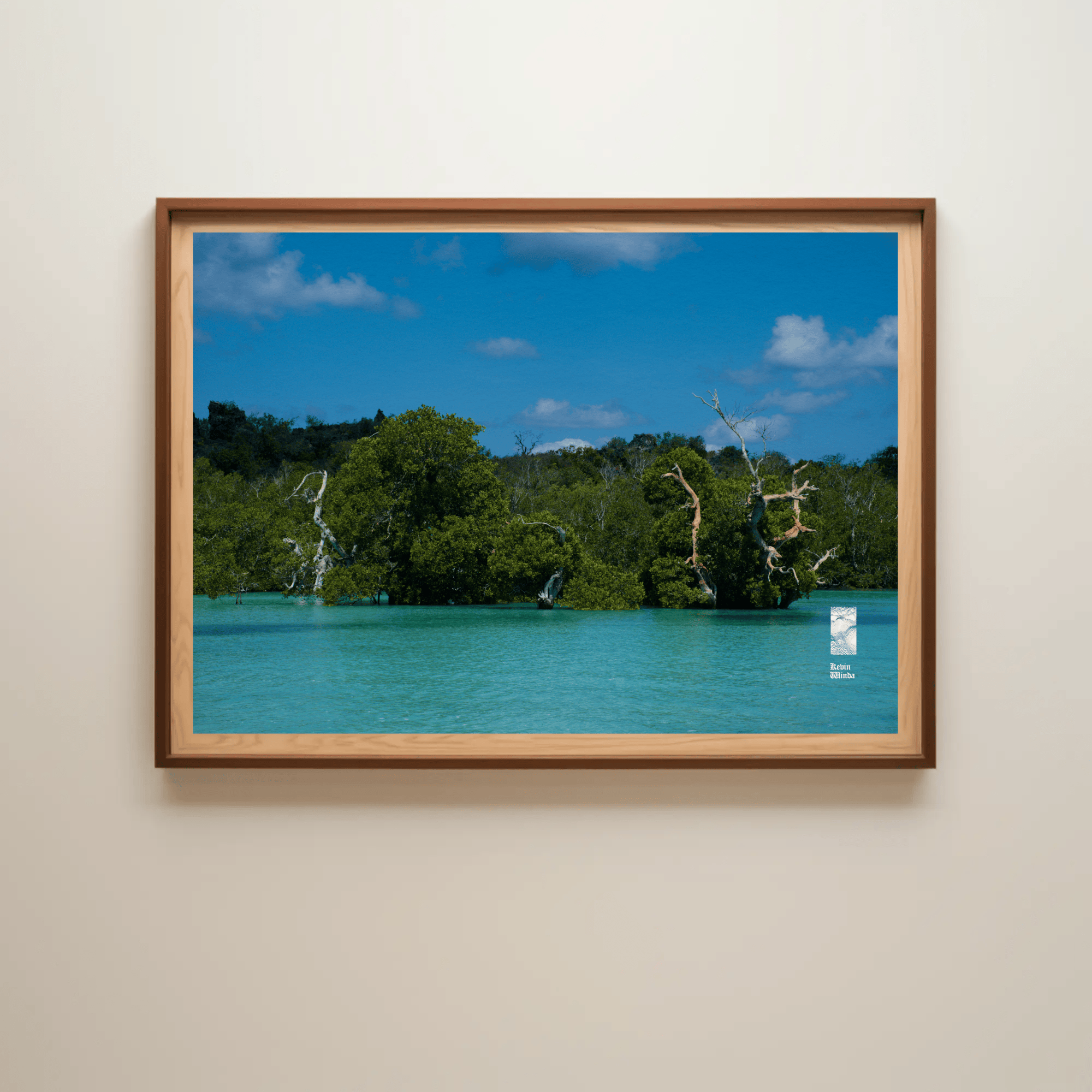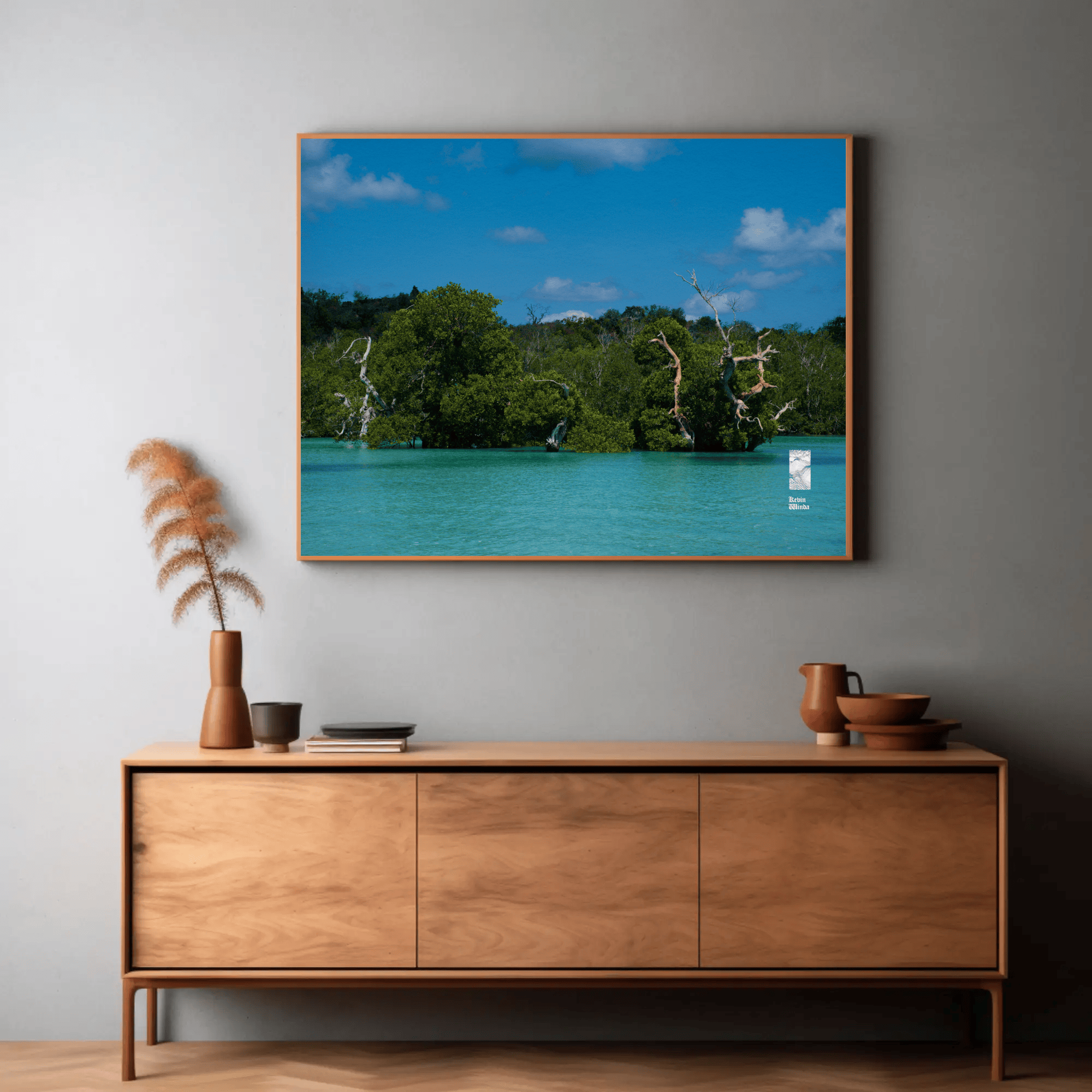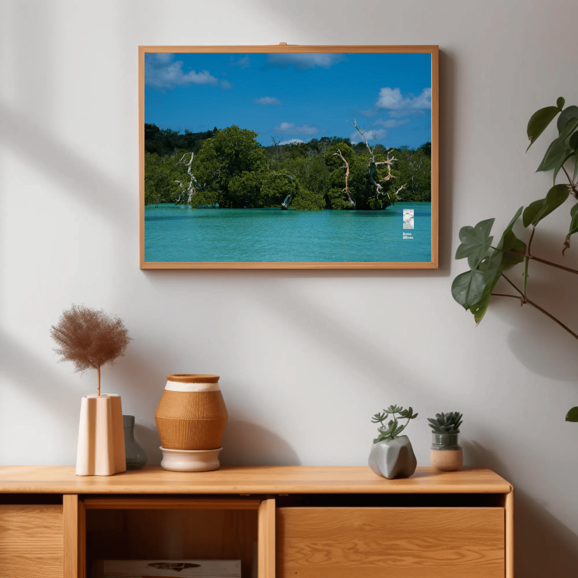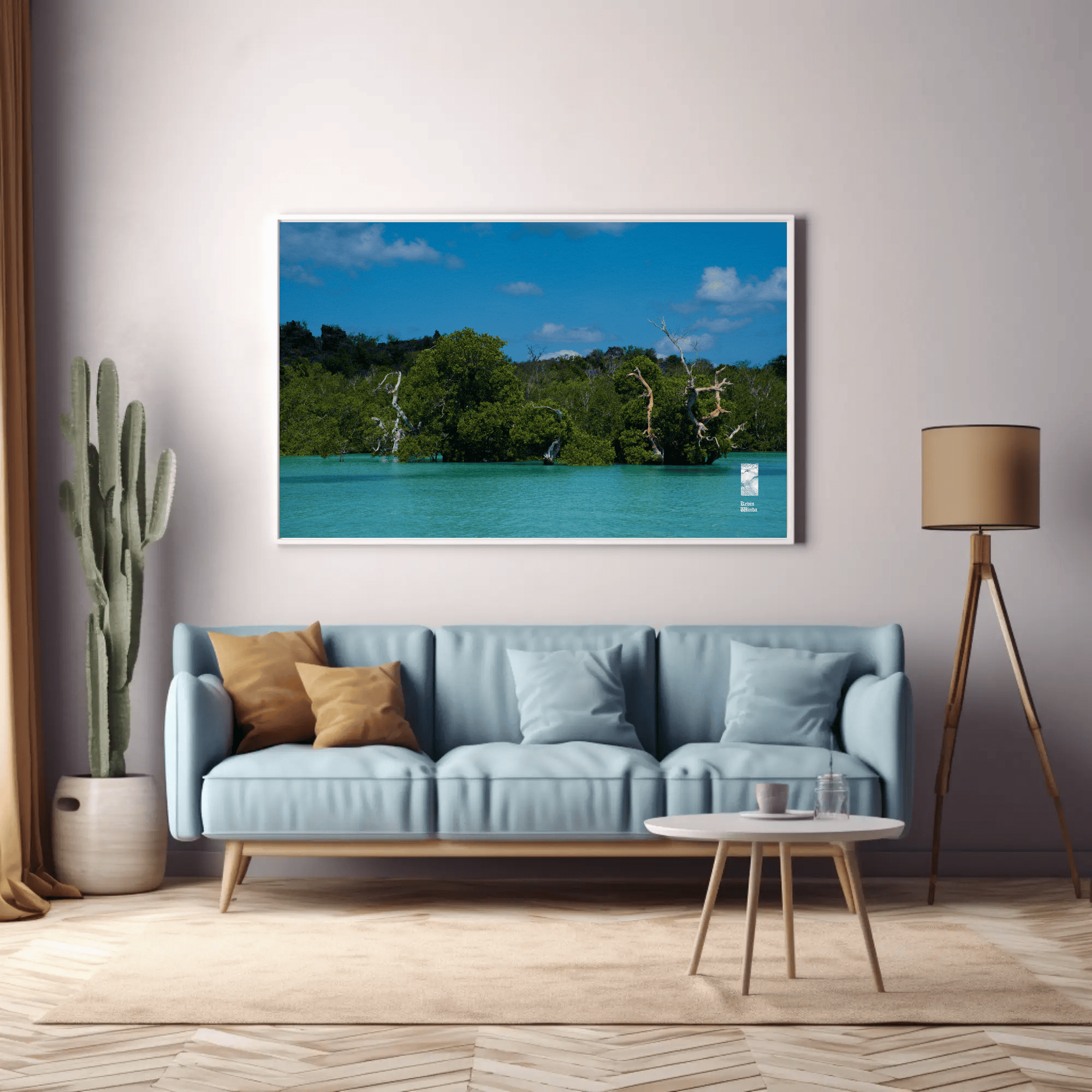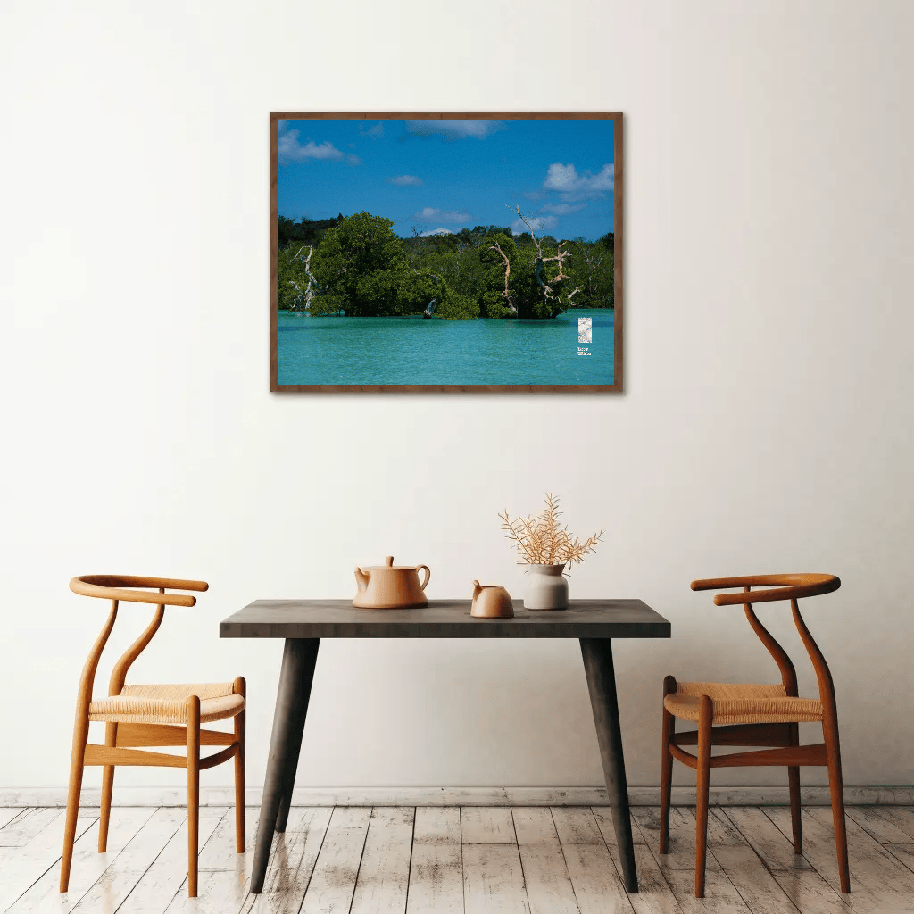 This ocean coast trees canvas photo print features a stunning depiction of coastal trees and ocean blue water. The photo scene captures the intricate details of the trees—rich green foliage and textured bark—framing the view of the glistening ocean on Rote Island, Indonesia. The water sparkles in light shades of blue, reflecting the sunlight and creating a sense of tranquility. Gentle waves caress the shore, while the horizon blends seamlessly with a clear sky, hinting at a peaceful, sunlit day.