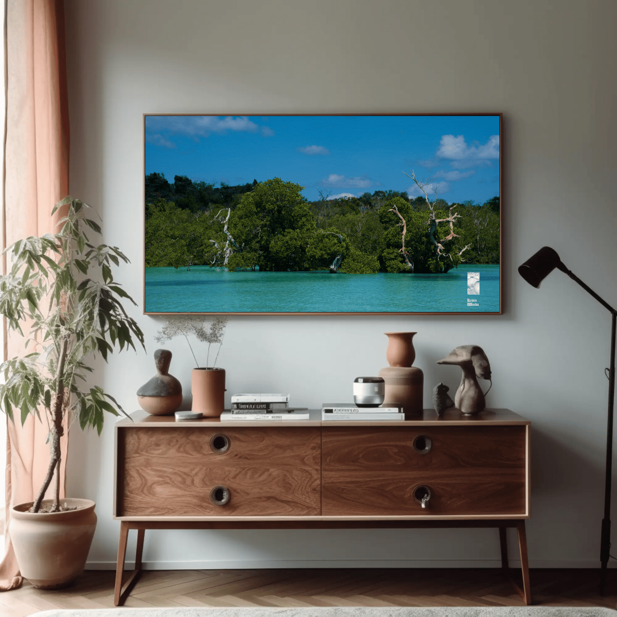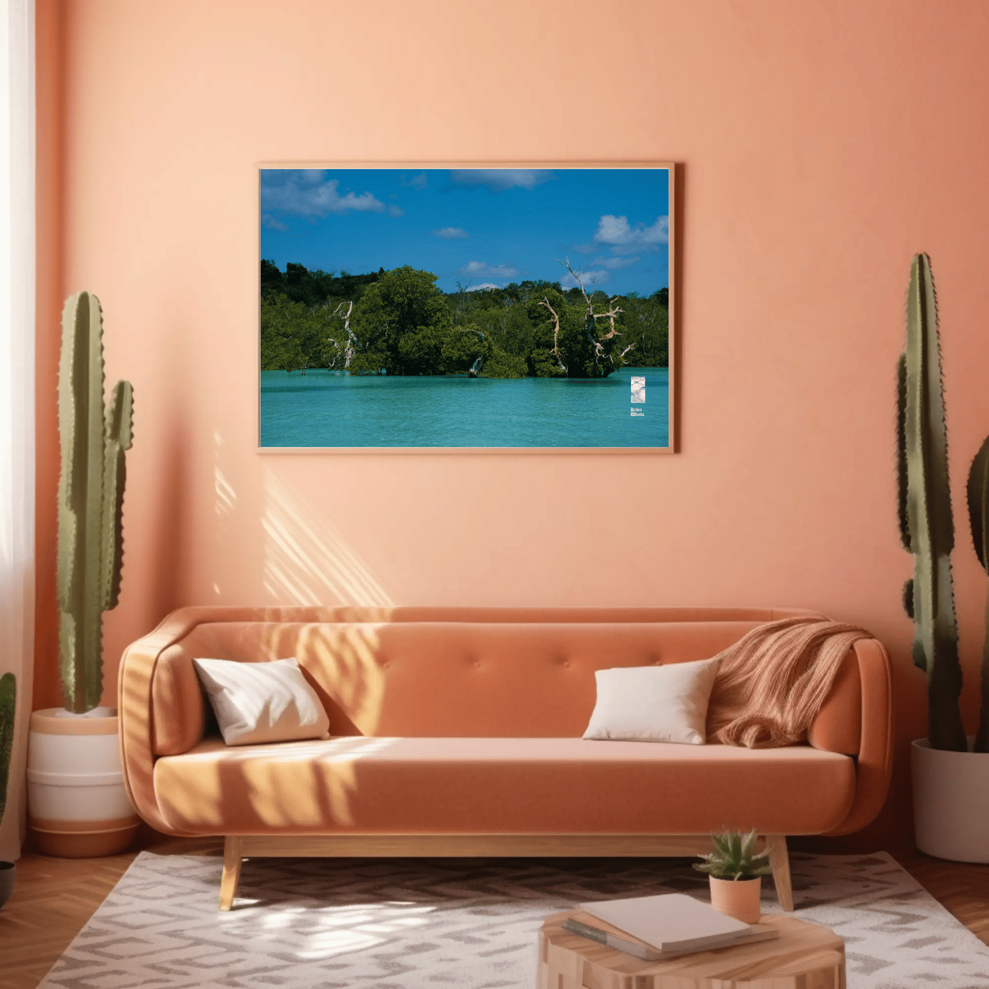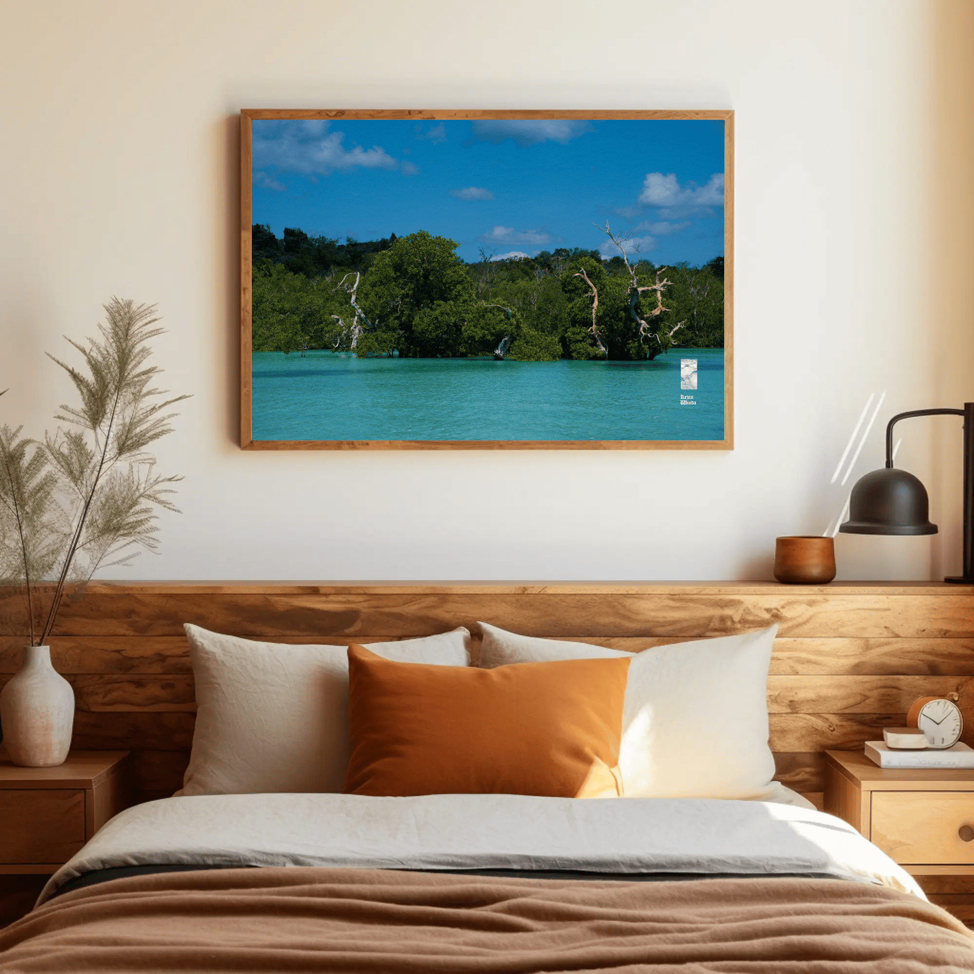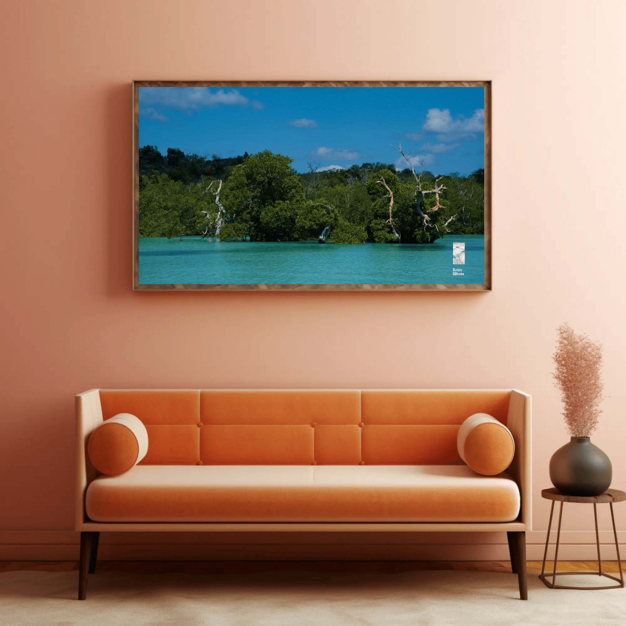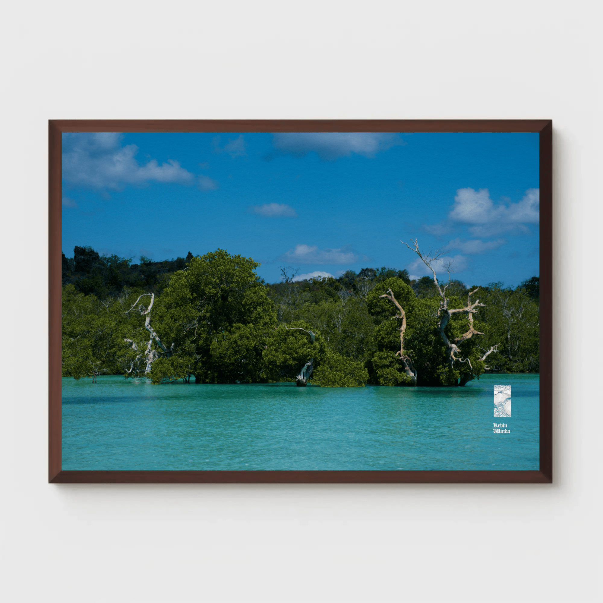 This ocean coast trees canvas photo print features a stunning depiction of coastal trees and ocean blue water. The photo scene captures the intricate details of the trees—rich green foliage and textured bark—framing the view of the glistening ocean on Rote Island, Indonesia. The water sparkles in light shades of blue, reflecting the sunlight and creating a sense of tranquility. Gentle waves caress the shore, while the horizon blends seamlessly with a clear sky, hinting at a peaceful, sunlit day.