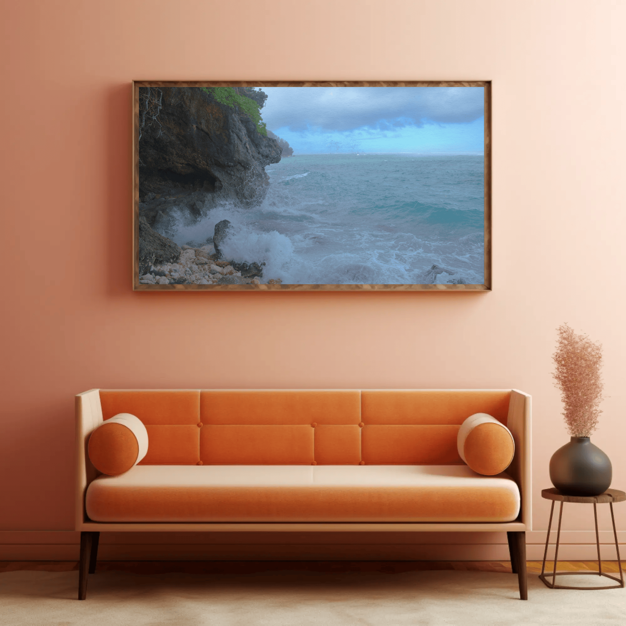 Canvas photo wall art vividly displays the dynamic interplay of ocean waves and rugged ocean rocks. The high-quality canvas material ensures vibrant colors and intricate details, making it a standout photo piece in your home or office decor.