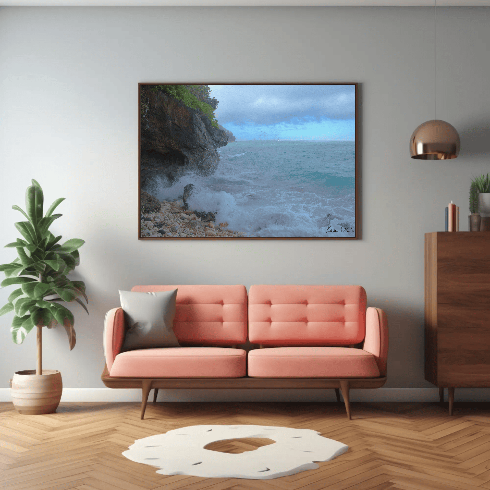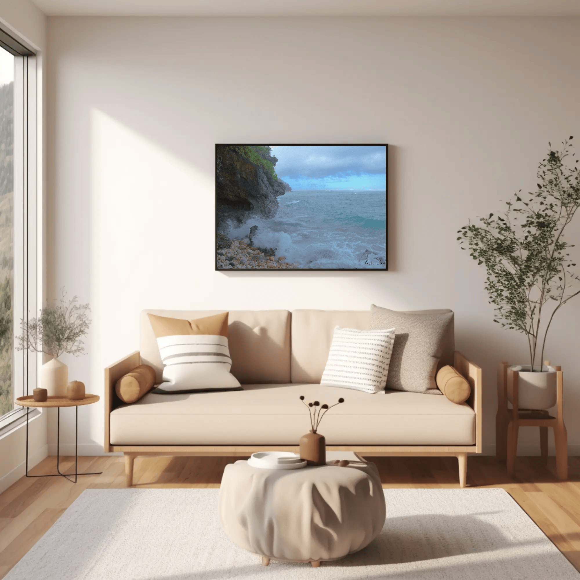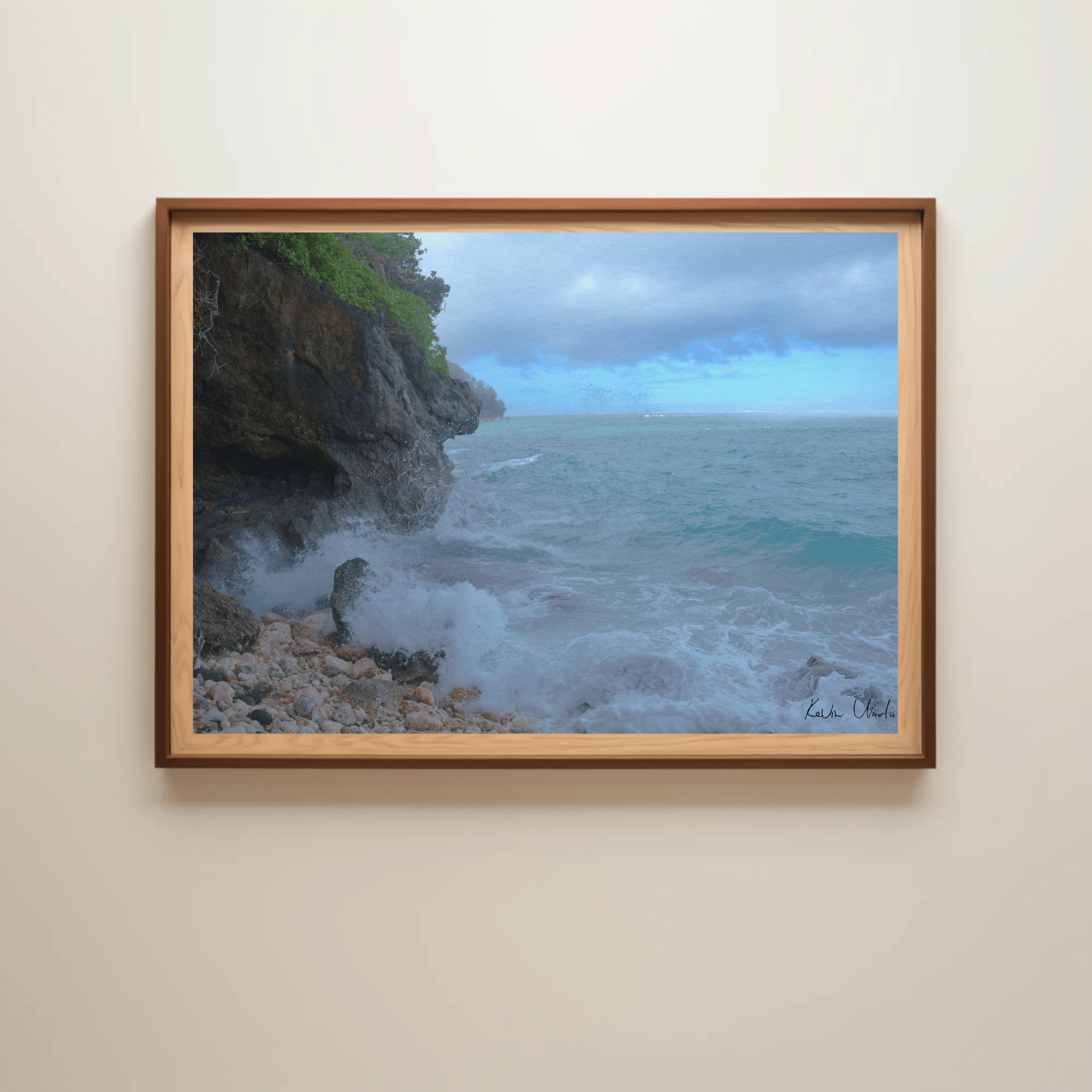 Printed on premium matte paper, this poster offers a sophisticated photo look with minimal glare. The matte finish of the print enhances the natural beauty of the ocean waves, rocky beach, and the cloudy skies above, creating a perfect addition to any decor.