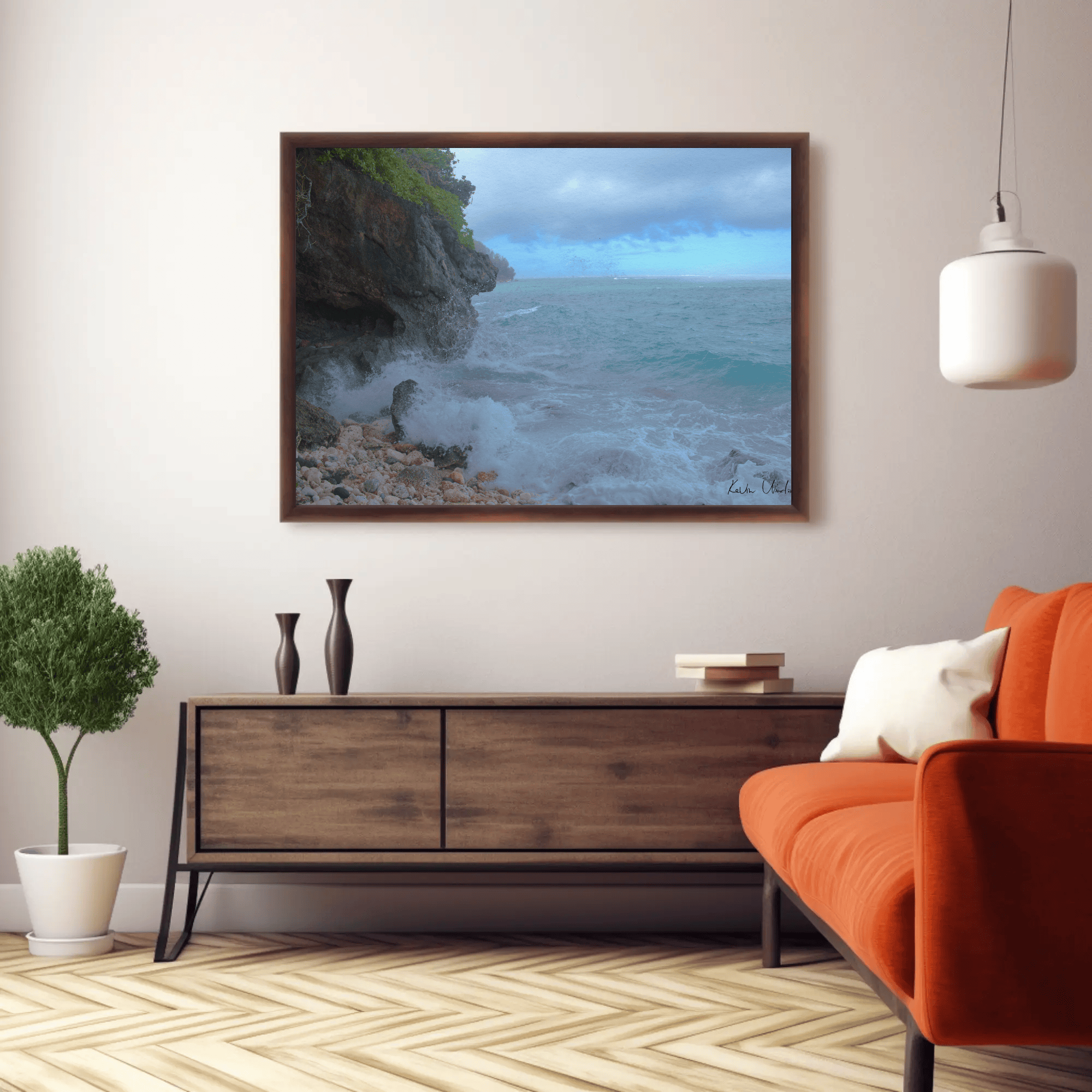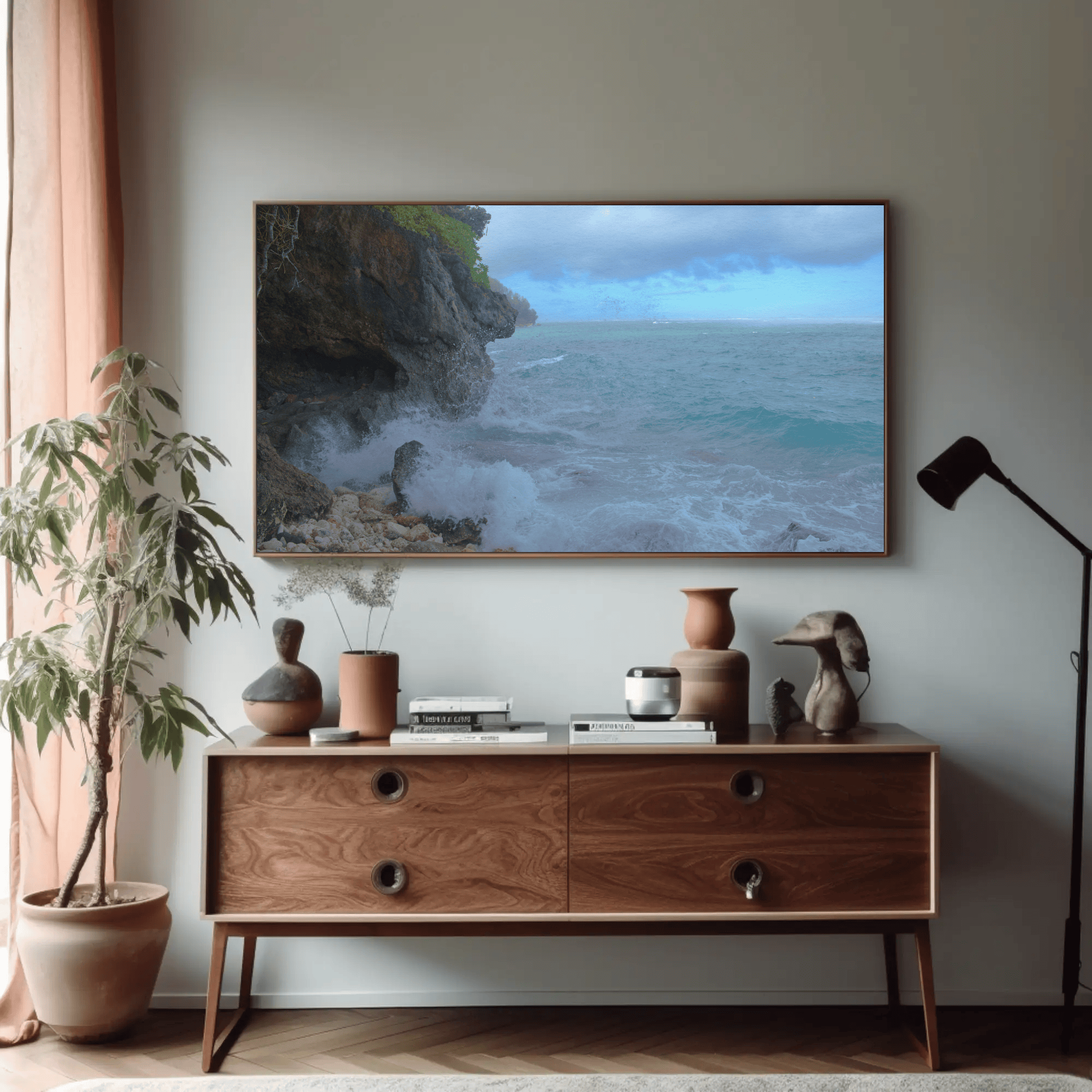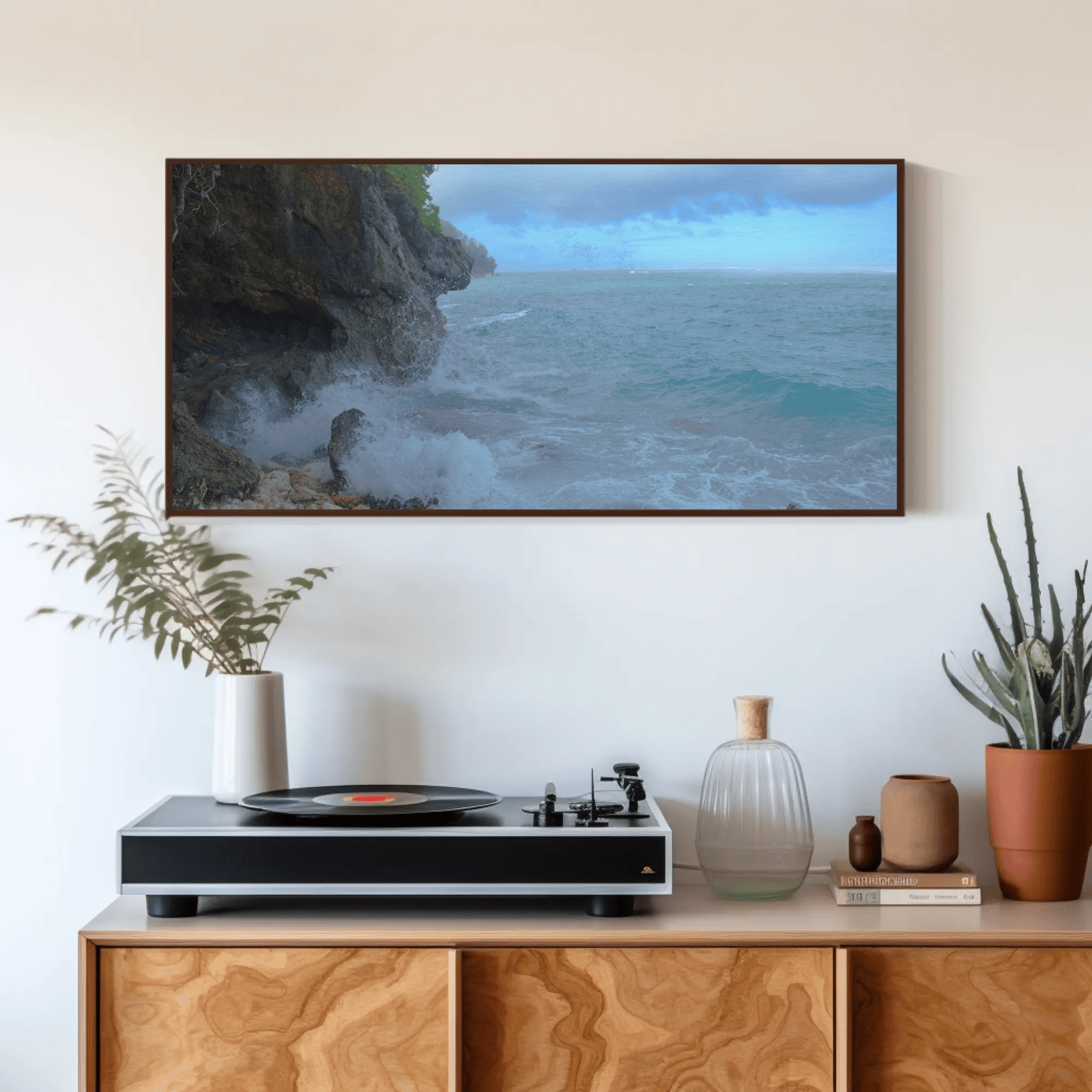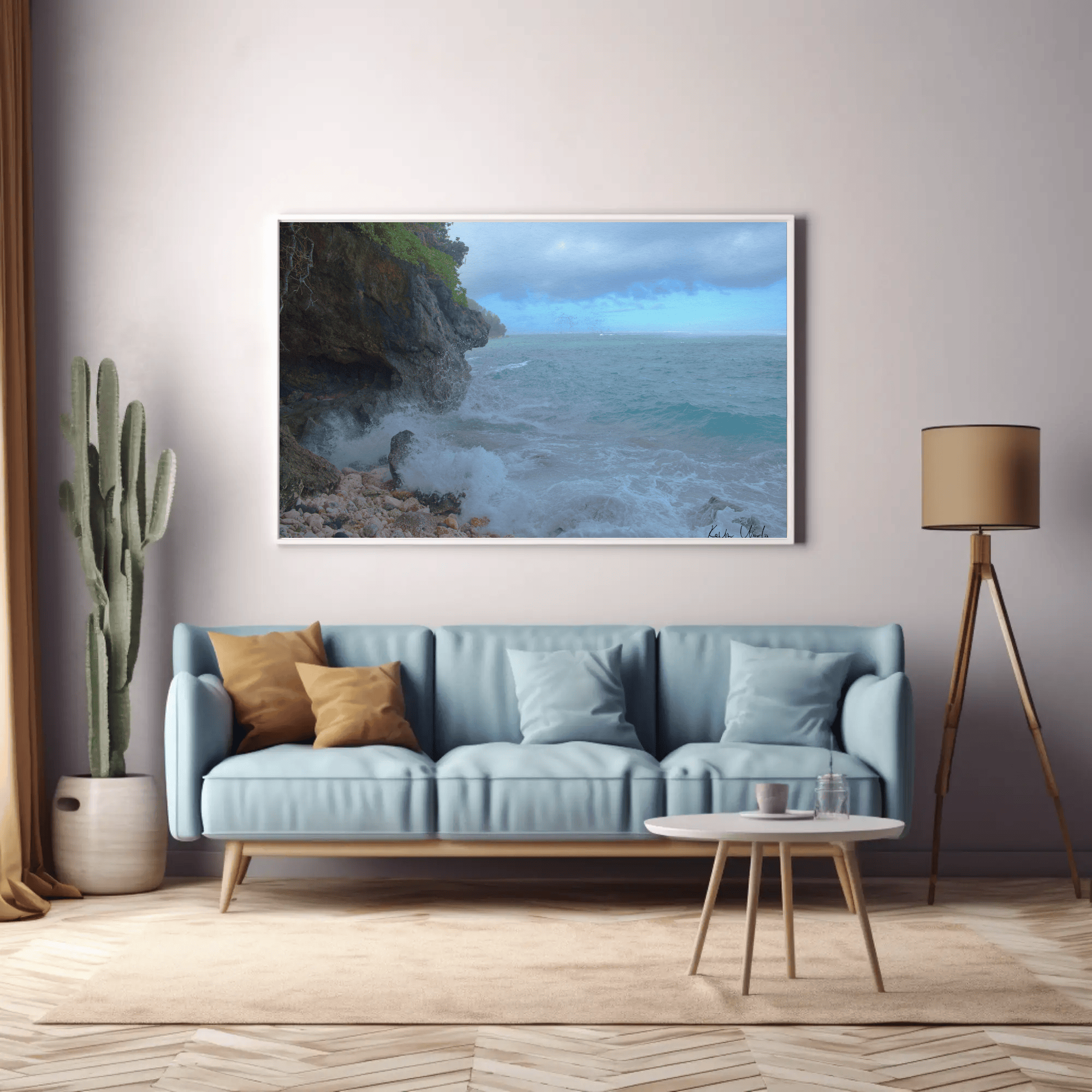 Mockups don't represent actual product sizes that you choose via variant options. Mockups just present artwork impressions in different environments. Frames and interior objects on mockups are not included in your order.